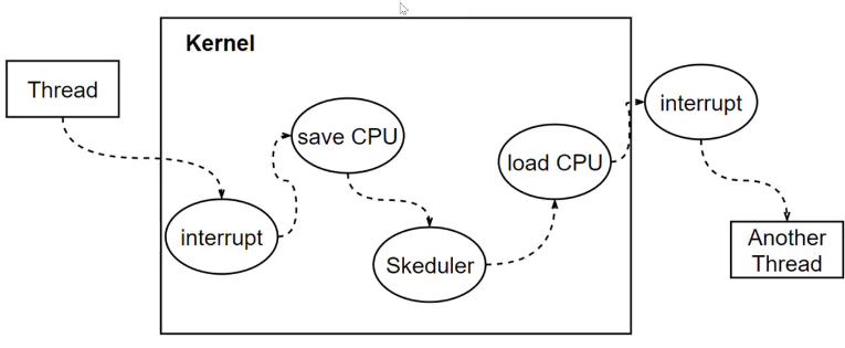 阻塞状态是由操作系统内核来进行切换:要存储当前线程的cpu状态,进入调度器,调度完又加载CPU状态;