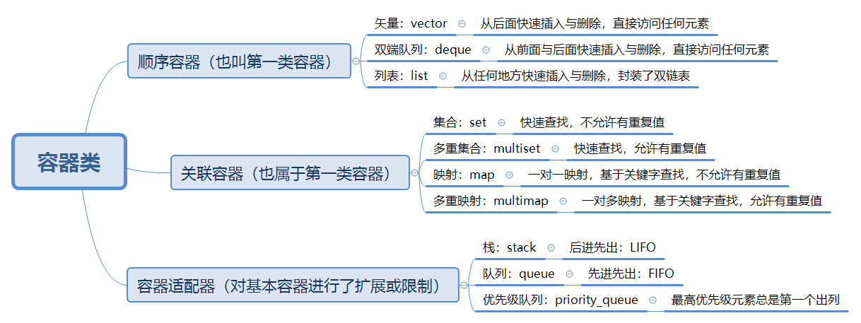 - 容器(Container),是一种数据结构,如list,vector,和deques ,以模板类的方法提供。为了访问容器中的数据,可以使用由容器类输出的迭代器;